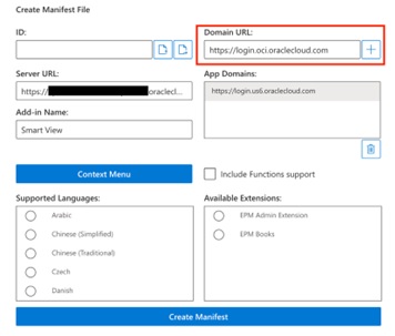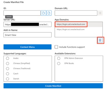 After adding, delete the original App Domain listed by selecting it and then click the trash icon. You do not need to check anything here unless you will be updating dimension members. (Note: For admins who will be updating dimensions, you will need to check EPM Admin Extension in the bottom right box). Select “Create Manifest.” |