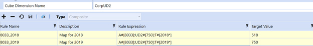 In this example, the composite mapping for account 8033 and department 750 are being mapped to 2 different UD2 targets, based upon the Year. For 2018 it is mapped to 518, while 2019 is mapped to 750.