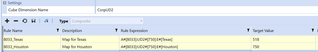 In this example, the composite mapping for account 8033 and department 750 are being mapped to 2 different UD2 targets, based upon the Entity. For Texas, it is mapped to 518, while Houston is mapped to 750.