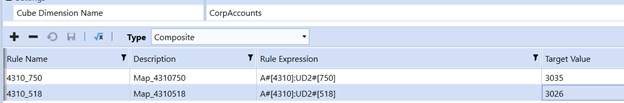 In this example, the composite mapping for account 4310 is being mapped to 2 different account targets, based upon the department. For department 750 it is mapped to account 3035, while for department 518 it is mapped to account 3026.