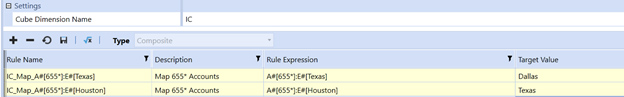 In this example, the composite mapping for I/C partner is based upon the source Entity and Account. Any account that begins with 655 is being mapped to 2 different I/C partner targets, based upon the entity. For entity Texas, it is mapped to I/C partner Dallas, while for entity Houston it is mapped to I/C partner Texas.