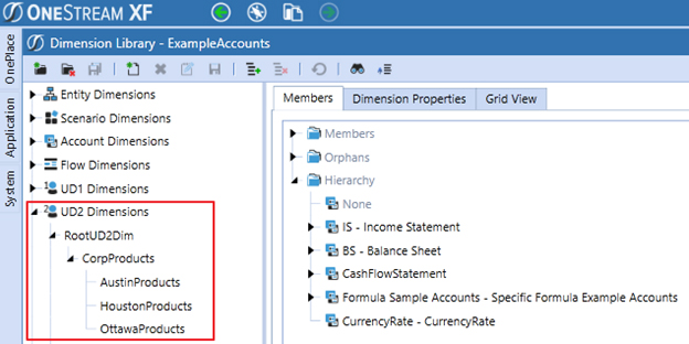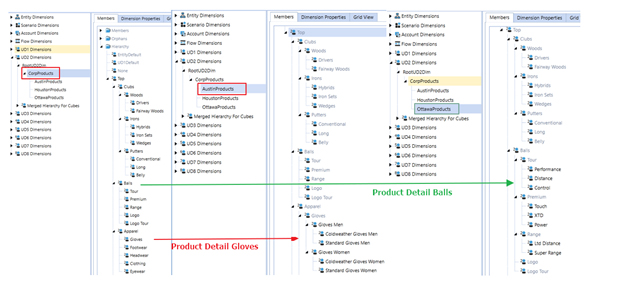 El concepto para agregar extensibilidad es el mismo que para las cuentas. Cada entidad puede cargar datos detallados del producto. A continuación podemos ver que bajo la Dimensión UD2 tenemos la dimensión Corp Products con hijos de AustinProducts, HoustonProducts y OttawaProducts.