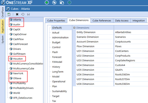 A continuación se muestra un ejemplo de dos cubos. El cubo Golfstream está utilizando CorpEntities. El cubo de Houston está utilizando HoustonEntities.