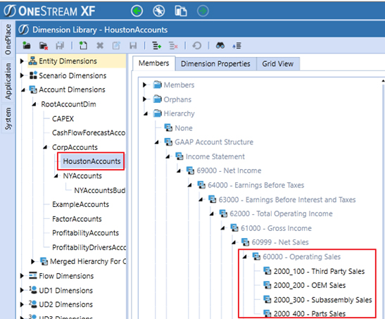 El miembro de Account Dimension, CorpAccounts, recopila datos en el nivel de cuenta de cinco dígitos 60000 de la mayoría de sus entidades. Houston puede proporcionar detalles más granulares por subcuenta 2000_100, 2000_200, 2000_300 y 2000_400. Este detalle solo está disponible y es relevante para las entidades y cuentas de Houston.
