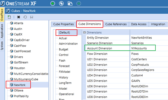 Las dimensiones del cubo se pueden cambiar según el escenario. En el siguiente ejemplo, vemos que la dimensión de la cuenta en Nueva York es diferente en el escenario predeterminado que en el escenario de presupuesto.