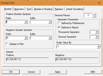 Los dos nuevos métodos descritos en este blog, a diferencia del método de columna de fórmula, en realidad no cambian los valores en la celda, sino que solo les dan formato. Si tuviera que usar estos valores en otra fórmula en el informe, tenga en cuenta sus signos naturales. Estos métodos son muy útiles si tiene muchas cuentas seguidas elegidas a través de las funciones de selección de miembros (hijos y descendientes de o si tiene muchas o columnas dinámicas).